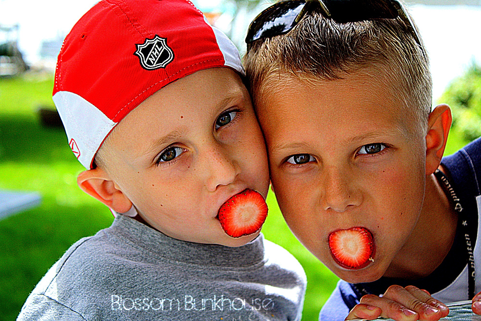 Sweet faces! I love how the hat brings out the red in the strawberries!